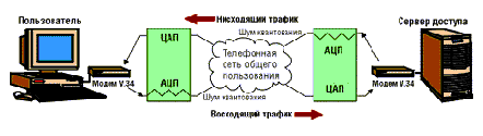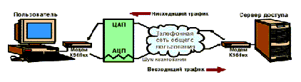 В этом случае провайдеру, если у него имеется на узле цифровое оборудование, не приходится преобразовывать поступающие из Internet сигналы в аналоговую форму при направлении их в телефонную сеть. Исключение этого преобразования позволяет снизить уровень шума и повысить скорость передачи. K56flex увеличивает скорость нисходящего трафика (в сторону пользователя) за счет того, что сигналы, передаваемые в цифровом виде, значительно меньше искажаются шумами. Восходящий трафик передается медленнее, так как на абонентском конце по-прежнему выполняется аналого-цифровое преобразование.