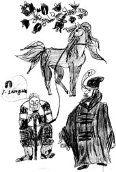 А теперь, о конях и гвоздях. Математику товарищу купцу знать надо было. Гвоздик-то просто сосчитался! Хотя считали все по разному. Машенька, например, посчитала, сколько будет стоить каждый гвоздик, а потом сложила их вместе. Получилось 16777215 полушек или 41943 рубля 15 полушек. Ого! Так и коня не жалко в придачу к гвоздям дать! Дорофеев Роман воспользовался жуткой формулой под названием "геометрическая прогрессия" (ее проходят в 9 классе, я спрашивал!) и тоже получил 16777 полушек. Так что, вот! Проторговался купец-то!