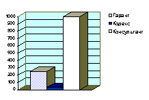 По изложенным причинам, предметом нашего дальнейшего рассмотрения станут именно "сопровождаемые" системы. В этом классе лидирующие позиции (не только в иркутском регионе, но и в масштабах страны) сегодня занимают три СПС: "Гарант", "Кодекс" и "КонсультантПлюс". Ориентировочное количество иркутских предприятий и организаций, являющихся пользователями этих систем, показано на диаграмме: