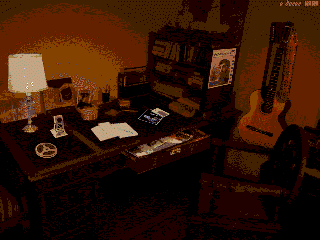 Давайте перейдем непосредственно к работе с диском. При запуске диска вам предлагается сделать выбор: произвести запуск программы, провести инсталляцию диска, или загрузить проигрыватель. Выбрав пункт "Запуск" вы попадете в главное меню программы. Перед вами предстанет часть комнаты Владимира Высоцкого - письменный стол с его вещами, рабочее кресло, книжные полки, гитара на стене. Причем предметы на столе являются интерактивными объектами, каждый из которых представляет отдельный раздел диска. CD-ROM включает в себя шесть разделов.