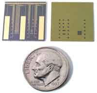 Посылка была такова: создание такого механизма подачи лекарств в организм человека, чтобы они поступали точно туда, куда надо, и точно в срок - чуть ли не по секундам. После пяти лет исследований и разработок родился прибор. Опять-таки, решение - микрочип, вживляемый под кожу. Содержит в себе около трех дюжин резервуаров с небольшим количеством различных лекарств, которые высвобождаются электрическим способом (под воздействием тока растворяется "крышка" резервуара). Объем каждого контейнера с лекарством весьма мал - 25 нанолитров. Но, видимо, примененный в нужном месте, в нужное время он может дать ожидаемый результат. На рисунке он показан в сравнении с десятицентовой монетой (где-то с наши 50 коп.). Достаточно сложная разработка. Основная трудность при создании была в том, как выталкивать лекарства из контейнеров, и наоборот - как туда вообще что-то закачивать. Стоить такие чипы будут, по оценкам создателей, немного - около $20. Но это учитывая, что там используется золото, а ученые планируют заменить его каким-нибудь более дешевым материалом.