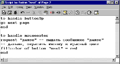К примеру: "to handle buttonClick" – обозначает, что сценарий запустится, если по объекту щелкнуть мышкой. "To handle mouseenter" – управление сработает, если мышь просто навести на объект. "To handle enterbook" – сработает в момент открытия книги, а "enterpage" – при входе на страничку. Типов "управлений", которые можно использовать, огромное количество, от реакции на отжатие правой мыши на объекте до реакции на операции в буфере обмена данных Windows.