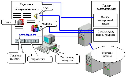 Базовым модулем системы электронных "книг" является программа, выполняющая функцию главного меню. Обучаемый, загрузив базовый модуль, имеет возможность выбирать интересующую его информацию и переходить в нужный раздел системы. Большинство учебных материалов системы, как и базовая электронная "книга", представляют собой многостраничные мультимедиа-"книги". "Книга" содержит текстовую и графическую информацию, разнообразные элементы управления (кнопки перемещения по книге, управления объектами на странице). Отдельные "страницы" имеют звуковое сопровождение. Для большего визуального эффекта страницы электронной "книги" содержат видеоизображения и анимационные ролики. К примеру, на занятиях по тематике мультимедиа обучаемые гораздо лучше и быстрее понимают материал, если имеют возможность самостоятельно пролистать примеры электронных "книг", просмотреть видеоролики, прослушать аудиофрагменты, ознакомиться с приемами управления объектами. Структура расположения компонентов электронных "книг" указана на рисунке.