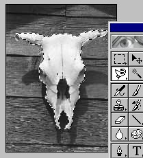 Вот что получилось (см. картинку). Причем, в этом типе выделения действуют все правила, которые присутствуют и в обычных инструментах выделения. Т.е. можно нажимая Alt или Shift добавлять или отнимать области selection. Что я и сделал, получив еще две дыры в черепе посредине. Ну вот, получилась симпатичная такая черепушка, вынесенная в отдельный слой, где теперь с ней можно делать все что угодно. Я выбрал такой пример, потому как он наиболее показателен, на самом деле, инструменту "magnetic lasso" безразлично, с цветной картинкой работать или с черно-белой. Разумеется, в опциях инструмента есть разные регуляторы чувствительности, полосы захвата и пр. И не бойтесь, если после того, как вы "замкнете" контур и программа сделает сама новое выделение (selection) вы увидите, что где-то чуть-чуть неровно - программа эти кусочки частенько сама подправляет, тем более, если стоит опция anti-aliased (а она по умолчанию всегда стоит). Ну вот, вроде основные фичи описал. А, да! Не ищите множественного Undo в верхнем меню - там его нет, а сделано History в той же менюшке, где и layers. Глубже еще не копал, но радость доставила появившаяся возможность изменить размеры прямоугольного выделения (selection). На 32Мб RAM идет вполне нормально, но лучше конечно, 64Мб, а то при