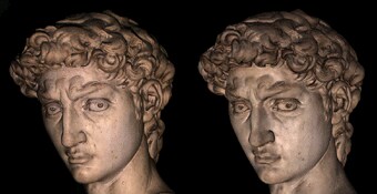 Это часть статуи Давида работы Микеланджело. Слева - обычная фотография, а справа - изображение трехмерной модели, просчитанной с модели, сосканированной вместе с цветом. Точность сканирования - 1мм (4млн. полигонов). (размер оригинала около 7м). Так что, 1мм для такой громадины - весьма неплохо. Вся же компьютерная 3х мерная модель статуи содержит 2 млрд. полигонов.