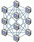 Напстер работает и по сей день. Правда, с некотрого времени (уже с месяц-два) я наблюдаю несколько не те объемы в онлайне, что были в начале его расцвета (Напстера). Как известно, сами сервера напстера являются лишь аккумулятором сведений о подцепленных пользователях (и их ресурсов), поэтому, поиск происходит очень быстро (еще бы - СУБД "клиент-сервер" получается). Это-то и ценно. А перекачка информации происходит напрямую - IP-IP - это тоже здорово. В общем, как всегда, идея хорошая, но реализация подвела. Но, свято место пусто не бывает (обратное тоже верно), и свободный от ошибок Напстера проект Gnutella предоставляет возможность обмена любым типом файлов без участия каких-либо "концентрирующих" серверов. Вся сеть Gnutella представляет собой просто набор юзеров, которые соединяются между собой посредством программы, являющейся клиентом и сервером для сети одновременно. Примерно так: