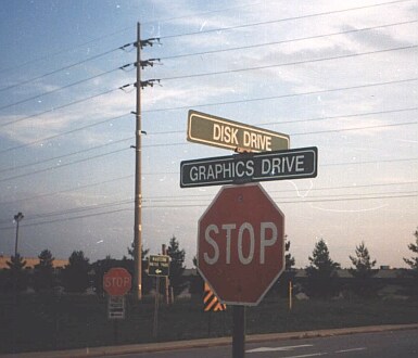 Как вы знаете, слово "drive" в американском понимании это "проезд к частному дому, гаражу или определенному зданию, соединяющий их с дорогой" ('drive way' - The American Heritage dictionary). А эти проезды соединяли здания компании Intergraph с шоссе (Highway20). Так как зданй много, то такие указатели необходимы. Но все же, если читать дословно, то получается "дисковый проезд", "графический проезд". А в интерпретации компьютерщика и вообще - "дисковод" :))) фотку прислал D.Sklyarov |