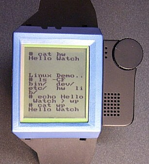 Так выглядит Linux, запущенный на 8Мб ОЗУ (плюс 8Мб флэш-памяти для хранения данных и программ). Кроме ввода информации посредством IrDA или радио, существует еще и ручной ввод - чувствительный экран и небольшое колесико сбоку. Операционная система - Linux (v2.2) плюс графическая библиотечка X11. Эффективность такого наручного компьютера пока неясна, но как часы работают они, наверное, неплохо :)