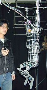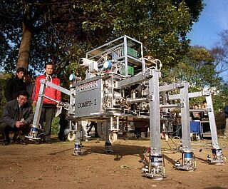 На рисунке - работающий прототип паукообразного робота, который предназначен для обнаружения мин. Разработан в университете Японского города Чиба (Chiba). Демонстрация робота проходит на корте университета - робот, перед тем, как наступить на землю какой-либо "ногой", может остановить ее у поверхности на растоянии 1-2см - датчики-детекторы мин, установленные на каждой ноге, проверят их наличие и подадут сигналы роботу для принятия дальнейших решений. Корпус робота выполнен из алюминия, высота - 1 метр, вес - 120кг. (не продается) фото - accosiated press |