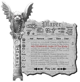 Достаточно красивый и приятный во всех отношениях проигрыватель звуковых файлов можно скачать на сервере UtrlaPlayer. Название у проигрывателя такое же.Чем отличается от сонма других? Мне дизайн и управление понравились больше чем у Sonique например. Не такой навороченный, но все что нужно - есть. Вот так он выглядит в начальном виде: