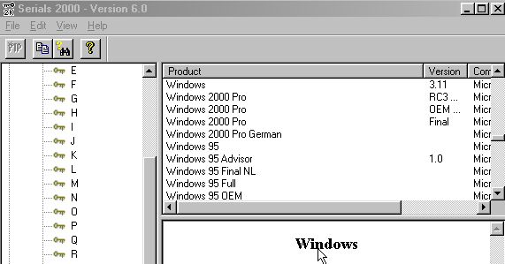 Программа прямо так и называется - Serials-2000. Сейриные номера представлены не только к программам для платформы PC, но так же, для Mac, Newton, PalmPilot, CE. Скачать можно и у меня - (1.7Мб программа) и последнее на сегодня обновление (от 1 июня 2000, 12kb). прислал DeAD |