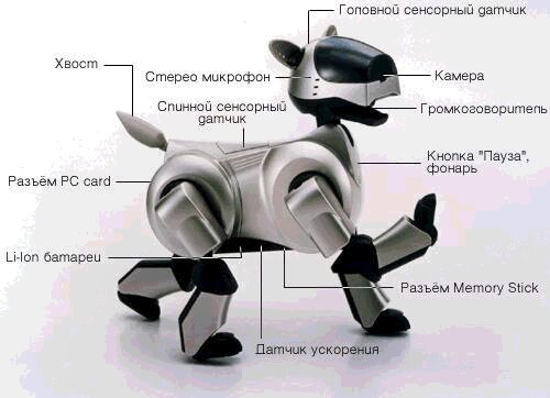 Судя по рисунку-схеме, несколько удивдяет место вставки PC карточки. Ладно. Больше интересуют датчики. Их у собачки 5 видов: датчик ускорения, ИК датчик (расстояние), датчик вибрации, сенсорные датчики (по разным частям "тела") и датчик температуры. Потребление 9Вт в автономном активном режиме, это на 1.5 часа "свободного полета" вместе с Li-Ion батареями. Вместе с ними же весит 1.4кг, габариты 30х30х15см. А, да, чуть не забыл! В комплекте идет мячик(!) использована картинка с сайта Sony |