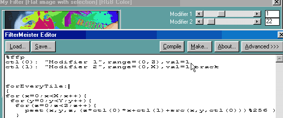 Я же говорил, что год нынче особо "билдерный". И точно. Только разобрались с DHTML menu builder (кстати, сообщают, что NN6 не любит подобных "наворотов"), как мне посоветовали обратить внимание на комилятор плагинов для фотошопа. Т.е. самым натуральным образом самому создавать исполняемые .8bf модули, не задумываясь о вопросах формата передачи данных, разработке интерфейса и пр. Итак, компилятор под названием FilterMeister сам выполнен в качестве модуля .8bf, поэтому для инсталляции достаточно переписать его в директорию плагинов в Photoshop.