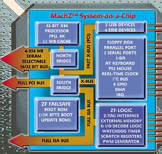 как выглядит чип "в боксе" можно поглядеть, ткнув в линк под картинкой Внутри - собственно 32битный процессор, работающий на частотах 128, 100, 66 и 33MHz, 8K кэш, FPU, поддержка 16/64/128 Mb SDRAM (максимум 256Mb всего), поддержка PCI, ISA, IDE, USB, serial порты и прочие обычные навески. Общая архитектура представлена на схеме ниже: