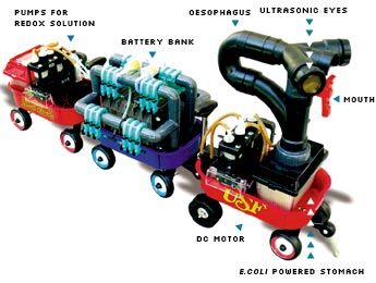 Показанный на рисунке прототип "кушающего" робота преобразует энергию распада сахара в электрическую (а куда денешься?) для подзарядки никель-кадмия в средней тележке (размеры каждой тележки около метра). В самой первой (на рисунке - справа) находится "желудок", который по-научному называется microbial fuel cell (MFC). Он содержит небольшую популяцию микробов, называемых "E.coli". Эти бактерии производят энзимы, которые разлагают большие молекулы углеводов (например глюкоза) на составные части. Во время этих реакций высвобождается большое количество электронов, которые и используются для зарядки батарей восстановительно-окислительными реакциями (redox). Кормят животину пока только сахаром - так как от него (от сахара), сами понимаете, отходов нет - он полностью разлагается. И энергии не настолко много, чтобы "паравозик" ехал быстро и долго. Полная подзаряка - едем дальше, батарейки сели - отдыхаем до следующего цикла. "Made in" в университете Южной Флориды. Кстати, такие "гастроботы" уже существуют в разных ипостасях - на сахаре, на спирте и даже на личинках. Последний был изготовлен в Английском университете (в Бристоле). Руководитель этого проекта прогнозирует использование "кушающих" роботов не для двигания машин - тут необходимо много энергии, а вот например, создание подводного робота, который будет курсировать вдоль пляжа и присматривать за наличием акул вполне возможно. Рыбку съел - поплыл дальше. Конечно, приучать есть мясо таких роботов не стоит - а то замкнет там что-нибудь - бегай потом от него... исползовалась статья