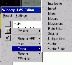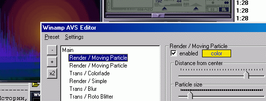 отрисовать объекты, наложить слои с эффектами, общее управление визуализацией и связь со звуком (музыкой). Вот связь с музыкой меня не очень удовлетворила. Единственная привязка эффектов может быть только к пиковому изменению амплитуды (это обычно низкие частоты). А где верхние, где средние? Хочу цветомузыку. Нет ее. Впрочем, обходясь даже только тем набором что есть можно наворотить очень много. Что и сделано - ткните правой кнопкой в окно эффекта - увидите множество пресетов (сам редактор AVS включатся левой кнопкой мыши).