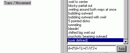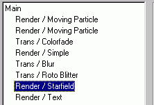 Однако, тут есть некоторый интересный момент в том, что всякие Blur, Motion, Colorfade и пр. общие эффекты (и даже эффекты действия с отдельными объектами) будут накладываться как бы на уже "ушедшие" фреймы (т.е. кадры, которые в секунду) и правило следования термов в списке на них распространяется не во всем. Обязательно обратите внимание на глобальный элемент Trans/Colorfade - при отключенном в 'Main' очистке кадра он позволит плавно очищать уже "прошедшие кадры", чтобы не получилось каши (хотя, и таким способом тоже можно делать эффекты). Воот, в общем, располагая элементы с термами один за другим, можно соорудить весьма фейерическую сценку. Однако, для пущей крутости существует еще элемент Trans/Movement, где