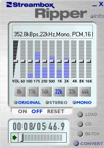 Владельцы известного развлекательного сервера fomenko.ru решили расширить виды подаваемых в он-лайн приколов - теперь можно послушать монологи известных сатириков в формате RealAudio. Вот, Задорнова послушал. Качество неплохое. Впрочем, чего там, голос-то жать... (кстати, с моего последнего анонса они добавили немного новых видеороликов). Жванецкого, которого я процитировал в эпиграфе, нет. А хотелось бы... А то всякой попсы напихали, а про Жванецкого забыли. Да, кстати, там весь звук лежит в формате RealAudio. Вполне разумно. Соотношение у RealAudio качество/размер для голоса очень хорошее. К тому же, Real G2 Producer умеет паковать live (т.е. на лету с line-in) - собственно, так же, как и nstools (microsoft). Но wma вставляет всякую фигню в поток. (Да, еще раз повторю :) [ссылки на download удалены] Real Player - проигрывает .RA и .RAM (видео), а RealProducer их, соответственно, создает. Там все просто и понятно, поэтому я их описывать здесь не буду, а лучше остановлюсь на следующей замечательной программе. Называется она StreamBox Ripper. Что делает: преобразует .mp3, .ra, .wav, .wma в друг-друга. Причем, интерфейс и внешний вид весьма и весьма меня порадовал.