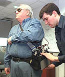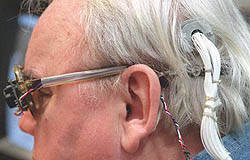 Все управляется переносным компьютером, который находится у слепого на боку. Электрические сигналы передаются на электроды, имлантированные прямо в мозг. Таким образом, благодаря технике, этот человек может более-менее ориентироваться в пространстве и даже различать большие буквы.