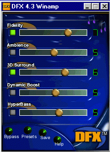 Весь пакет DFX можно скачать с оригинального сервера разработчиков (можно скачать у меня [180kb]), а кнопочка "3D surround" включается этой небольшой программкой (14kb). Кое что про плагин можете почитать в разделе Sound. |