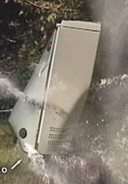 Комп просто снесло с пенька обычной картофелиной! :) Правда, картофелина эта летела с очень большой и необычной для нее скоростью, будучи выпущенной из длинной пневматической пушки "картофелестрелялки". На сайте SpudCannon в картинках и деталях (со схемами!) рассказано как построить такую пушку.