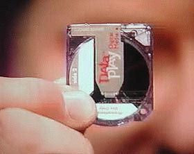 Которое состоит в том, что помимо 2 тюнеров и записи программ в DVD качестве 36 часов видео в цифру, можно посредством [сервиса] WebTV выбирать нужные программы, искать фильмы по актерам, названиям и пр. Стоимость железа (без магнитофона) около $400 и всякие там ежемесячные платежи в районе $10-15 за ISP, WebTV сервис, DVR сервис и пр. 6 - Motorola iRadio - весьма навороченный (в плане hi-end технологий) комплекс, предназначенный для использования в автомобиле - GPS, связь, аудио, разнообразный информационный сервис и т.п. Управляется голосом. Т.е. имеется система распознавания речевых команд. Программно все управляется на основе Java, все интерент-совместимое и пр. и пр. 7 - Pioneer CL Organica color display - результат 10-летней разработки фирмы, цветной дисплей (плоский конечно), который выгодно отличается от LCD тем, что изображение хорошо видно даже когда смотришь сбоку, элементы экрана сами по себе активны, излучают достаточное количество света и потребляют мало энергии. 8 - DataPlay Digital Media discs - если эти диски пойдут хорошо в производство - это будет жесткая конкуренция флэш-карточкам, которые безобразно дороги сегодня. Посудите сами - за диск емкостью 500Мб просят всего 10 баков (за 250Мб, соответственно, в 2 раза меньше). Размеры видны на фотографии.