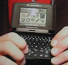 Причем, устройство чтения получилось у компании тоже достаточно маленьким, чтобы использовать его во всяких карманных проигрывателях MP3. На правой фотке показано, как такой диск используется в цифровой видеокамере. А если USB адаптеры для них будут легко доступны, то это еще и сильно заставит задуматься о приемлимости CDRW. А что? Его хоть в карман можно положить. Хоть и стоит дороже пустой RW болваночки. С другой стороны, CD приводы пактически есть везде, а вот DataPlay еще внедряться и внедряться. Кстати, массовый выпуск обещают чуть ли не этом году. 9 - Panasonic VDR-M10 DVD camcorder - собственно, из названия все понятно - цифровая камера от Panasonic, которая записывает видео на DVD диск (2.8Гб DVD-RAM minidisk), этот диск потом можно проигрывать в соответствующем стационарном проигрывателе, а еще можно поток гнать с камеры на PC через USB интерфейс. Один минидиск диск вмещает 2 часа видео. Одной из особенностей отмечают способность камеры искать пустое место при записи нового куска, чтобы избежать затирания уже отснятых частей. Но я не вижу тут ничего странного - это само собой разумеещееся при использовании записывающей среды с минимальным временем доступа к любой области - т.е. нелинейной. 10 - FutureCom PC-EPhone - в общем, достаточно интересная штатовская разработка (PC-EPhone Inc.), в которой попытались совместить 2 устройства - PDA и сотовый телефон. Сам PDA имеет полнофункциональный LCD экран 640х480, операционную систему WindowsCE и выглядит "в лицо"