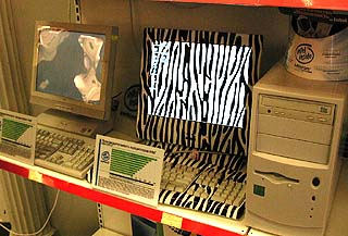 А этот комп с зебрововидной раскраской интересен тем, что... Ну, во-первых, он сам по себе с плоским экраном, а процессорный блок выполнен в виде маленькой подставки под монитором - на левой части фотки это хорошо видно. Да, так вот, про раскраску: фон у рабочего стола виндузы плавно так продолжается на раскраске монитора и далее. Причем, очень точно (я поглядел - почти идеально). Я думаю, сначала нарисовали картинку десктопа, вывели ее на экран, а потом доразрисовывали уже корпус. Хотя совершенно не понимаю, кого может приколоть такая раскраска. Разве что, зебру.. |