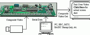 Ну вот, показательный пример - такой информации в большинстве случаев хватило бы вполне. Стоимость. Цена на наборы "собери Serial LCD сам" может колебаться от $30 до $100, готовые - до $200. Мда.. дороговато.. Есть еще один производитель - HVW Technologies Inc. (Канада), который кроме подобных LCD наборов производит одну простенькую на вид платку - накладыватель текста на видеоизображение. Из схемы все понятно: