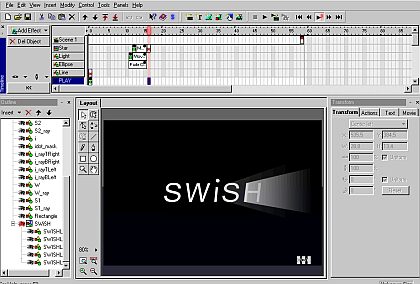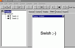 - проще некуда. ![]() Swish v1.5 Но версия Swish2.0 уже может поспорить с настоящим Flash редактором. Хотя бы в плане готовых эффектов и более структурным интерфейсом для работы со сценой. Я так полагаю, что ребята еще немного поработают над следующими версиями и Flash окажется в том положении, когда он будет нужен только для создания действительно сложных мувиков. ![]() Swish v2.0 Вот так выглядит Swish2.0. Чего не хватает: не хватает переменных и вообще,