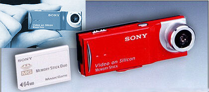 Но SMaL не самая маленькая цифровая камера. Я уже писал как-то в сентябре прошлого года, что SONY выпустила вариант "шпионской" камеры с использованием MemoryStick. Размеры камеры можете видеть под картинкой. 64Мб уменьшенный модуль Flash - это примерно 1000 картинок в 640х480. Неплохо.