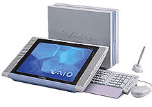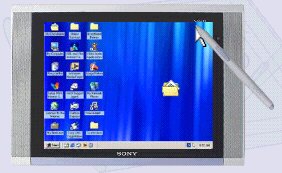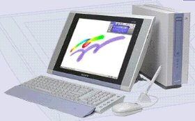 Но это еще не самые сложные проблемы. Как видно из рисунка, положение экрана уже не классическое - плоскостью вертикально к пользователю. Экран может лежать на столе полд каким-то углом или вообще, горизонтально. А угол зрения на ЖК панель небольшой. Разработчики даже подумывали сделать этакие сенсоры, чтобы когда пользователь откидывается на спинку стула и ЖК оказывается не в том углу зрения, то происходила корректировка поляризации ЖК. Но от этого непопулярного решения опять спасла фирма Hitachi, которая сделала специально для VAIO ЖК панель с очень большим углом обзора - до 170 градусов. К тому же, панель должны быть достаточно тонкой, чтобы нармально работать с сенсором, который находится под ней. Вот. А потом уже начали напихивать всяким добром. 1GHz процессор PIII, 128Mb ram, 40Gb HDD, мультимедия, CD-RW, разъемы - на любой вкус, модем, Ethernet и пр. Как ни удивительно, все это добро стоит $3000 - не так дорого, между прочим, для компа, на котором предустановлено море софта. В основном от Adobe и Micrsoft. Операционная система - Windows ME.