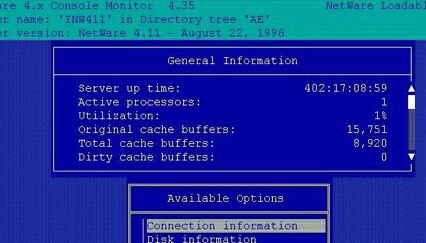 Выдержать uptime для сервера максимально возможным - занятие не для слабонервных. Конечно, когда сервер стоит себе и крутит Novell как файлохранилище, то это куда ни шло, а вот когда на нем что-то ломается или появляется острый зуд проапгрейдить систему - то все, на uptime кидается прощальный взгляд. Самое большое у меня NW 3.10 простоял около года. После этого NW4.11 стоял 320 дней. Вообще, Novell система весьма надежная и удобная - взять хотя бы возможность свободного манипулирования драйверами сетевых карт и разными протоколами. Никто, знаете ли не просит после изменения IP "перезагрузить компьютер". Вообще, на юникс смахивает :) Вон, и /etc/ есть - там как раз все настройки.