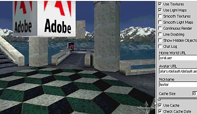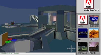 Конечно, для просмотра творений веб-демиургов необходим плагин. Это плейер, который называется Atmosphere Browser, основан он на технологии MetaStream (MetaCreations). Плагин можно скачать на сайте Adobe (4.5Mb). Там же можно поглядеть готовые миры (галерея).