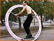 Только одно колесо для передвижения - идея не очень новая: например, я как-то писал про прозрачный шар из полиэтилена с полостью внутри, где мог находиться человек и переступая по поверхности внутреннего шара, передвигаться. Потом, где-то была фотка мопеда, вся конструкция которого состояла из одного колеса и собственно, механикой и сидением внутри. Украинский изобретатель из Харькова все еще более упростил. Основной тонкостью в конструкции является запатентованный метод креления