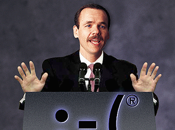 Подпись под фотографией: "Dr. E.L.Kersten, основатель компании Despair, Inc., озвучивает планы по преследованию судебном порядке против миллионов [людей], нарушающих закон о защите торговой марки". Торговая марка в виде хорошо всем известного значка :-(