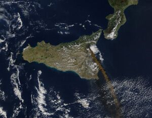 Более чем 300 км выброс пепла и дыма из жерла вулкана Этна (на Сицилии). Снимки из космоса на 29 октября.