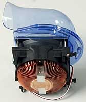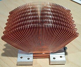 Заметьте - сами радиаторы тоже медные и лепестковые. Вентилятор перевернут и выдувает горячий воздух наружу через пластиковый кожух. Резонно. Есть в комплекте даже свой регулятор скорости вентилятора. Впрочем, детальный обзор этого кулера можно прочитать вот здесь. А вот здесь - новые боксовые кулеры для P4 3 ГГц. Видать лепестки подглядели у зальмана. |