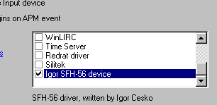 Как раз есть Vishay-евске TSOP-ы, Agilent-овские приемопередатчики HSDLxxxx (почти всех серий) и др. оптоэлектроника. Выложил у себя [450kb], PDF (и еще - здесь). Крутейшая крутотень! :) огромное спасибо Александру Едем дальше. На самом деле, связка WinLIRC и Girder несколько тяжеловата и давно есть хороший "hardware" плагин для простых ИК устройств типа вышеуказанных TSOP, SFH и др.