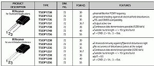 Один из читателей откликнулся на просьбу о собрании "хоть какой-то" документации по характеристикам и разводке ножек для ИК-приемников. Прислал большой PDF, в котором собраны если не все, то очень многие оптоэлектронные приборы. В удобоваримом виде. Примерно такая структура таблицы: