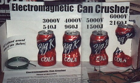 Недорогой, почти портативный разрушитель жестяных банок: Я как-то уже описывал страничку оюбителя поиграть с катушкой и конденсатором большой емкости, но вот на этой страничке как-то все нагляднее. Даже принципиальная схемка есть. Все просто - банка помещается в катушку с небольшим количеством витков (5 например), заряженный конденсатор (большой емкости и большого напряжения) отдает энергию катушке, вокруг которой возникает магнитное поле большой силы, которое наводит в банке ток, который создает свое поле, которое взаимодействует с полем в катушке... В общем, крайней оказывается банка :) Катушке тоже может приходиться несладко - при достаточно большой энергии ее тоже разрывает. Мне аж самому захотелось собрать такой can-crasher. А я