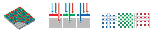 Над чувствительной подложкой находится мозаичный фильтр, который к единичному детектору пропускает свет определенной длины волны. Синий, красный или зеленый. Зеленого в одном квадратике присутствует 2 пикселя - (выбран зеленый - потому что он наиболее воспринимаем человеком), таким образом, о цвете в итоге получаем 50% информации о зеленом и по 25% информации о синем и красном. Тем более, что все это еще и увеличивает "полезный пиксел" в 2 раза. Разумеется, выход из этого положения есть. Во-первых, можно сделать слоистую структуру и сразу при той же технологии увеличить разрешающую способность матрицы в те же 2 раза.