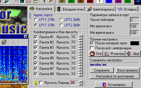 Создание цветомузыкального пульта из компьютера дело несложное в железном плане, но не такое простое в софтовом. Плагин для Winamp'a уже я рассматривал (Diskolitez), но он страдает некоторыми недостатками - например, нельзя устанавливать опорные уровни яркости для ламп, нет функции бегущих огней. АРУ опять же нет (normalizer не в счет). Так вот, братья Панфиловы (о как!) сделали хороший пультик. Наворочен достаточно, чтобы закопаться в нем надолго. Я только основные вещи смог поглядеть/покрутить за 30 мин. Программа называется ColorMusic.