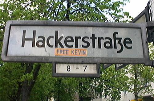 Хакерштрассе. Заметьте наклейку на указателе. Кто-то ну никак не мог упустить такого удобного случая.