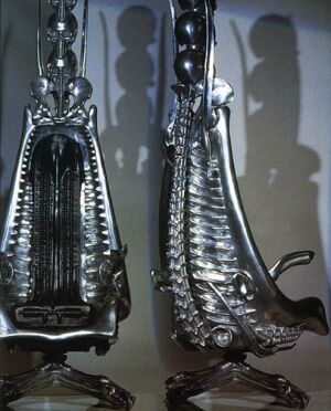 Изображения на фотке - реальные алюминиевые креслица, которые снимались в "Дюне". Эскиз делал достаточно известный художник Giger. Именно он рисовал и делал эскизы для моделей в фильмы "Чужие". И монстров для ID-software рисовал (кстати, надо посмотреть по титрам). У него вообще, все творчество сдвинуто на всяких монстров, "некро" и прочую "кладбищенскую романтику". Ну, нравится ему :)