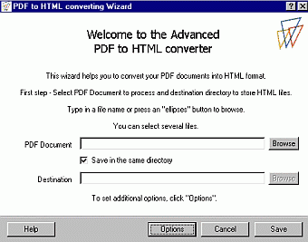 Advanced PDF to HTML converter. Оригинальный сайт. (скачать там же, 700кб). Есть две версии - облегченная и PRO. Облегченная - с ограничением по времени использования (триал то бишь), а про - без ограничения и еще имеет блок batch-convertion.