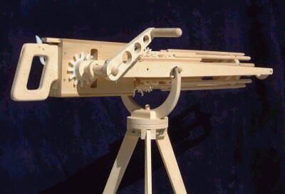 Полностью деревянный - стреляет с помощью резинок. Т.е. обычный детский самострел, которыми баловались все в детстве, только механизированный - двенадцать стволов, 144 резинки (ссылку я дал, там все на английском плюс 2-3 картинки). |