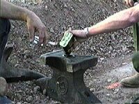 Рецепт следующий: засыпается 200г черного пороха в отверстие в наковальне N1, отверстие прикрывается четырьмя игральными картами, а сверху ставится еще одна наковальня N2 - килограмм в 40, поджигается огнепроводной шнур и вот -