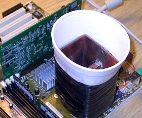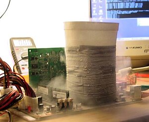 Глубокий холод пошел в наступление. Уже явно необходим жидкий азот для охлаждения процессоров в процессе оверклокерства. Если раньше оверклокер мог вполне обойтись очень хорошим вентилятором или даже водяным охлаждением, то теперь без экстремально низких температур никак. Без экстремального охлаждения, я бы сказал. Вот здесь североевропейцы (финны кажется) во всей красе показывают процесс заливки в емкость (самодельную) жидкого азота.