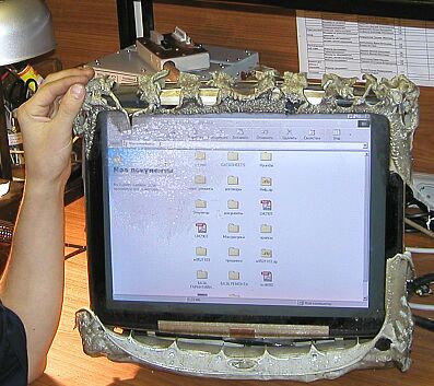 Будни ремонтной мастерской. Видно, что монитор поджаривался. Но несильно. Хотя покрытие верхнего левого угла кинескопа успело попортиться. фото прислал bull |